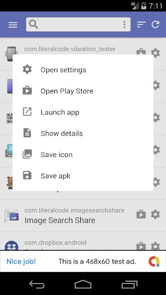* By tapping a row of an app, menus such as "Open settings" and "Open with Play Store" will be displayed. You can also save icon images and app files (.apk).