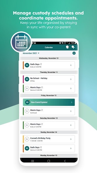 SHARED CALENDAR: co-parents can manage custody schedules and coordinate appointments, staying in sync and avoiding conflict.