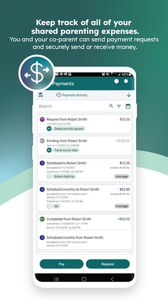 ACCOUNTABLE PAYMENTS: co-parents can keep track of all shared parenting expenses, easily making payment requests and securely sending or receiving money.